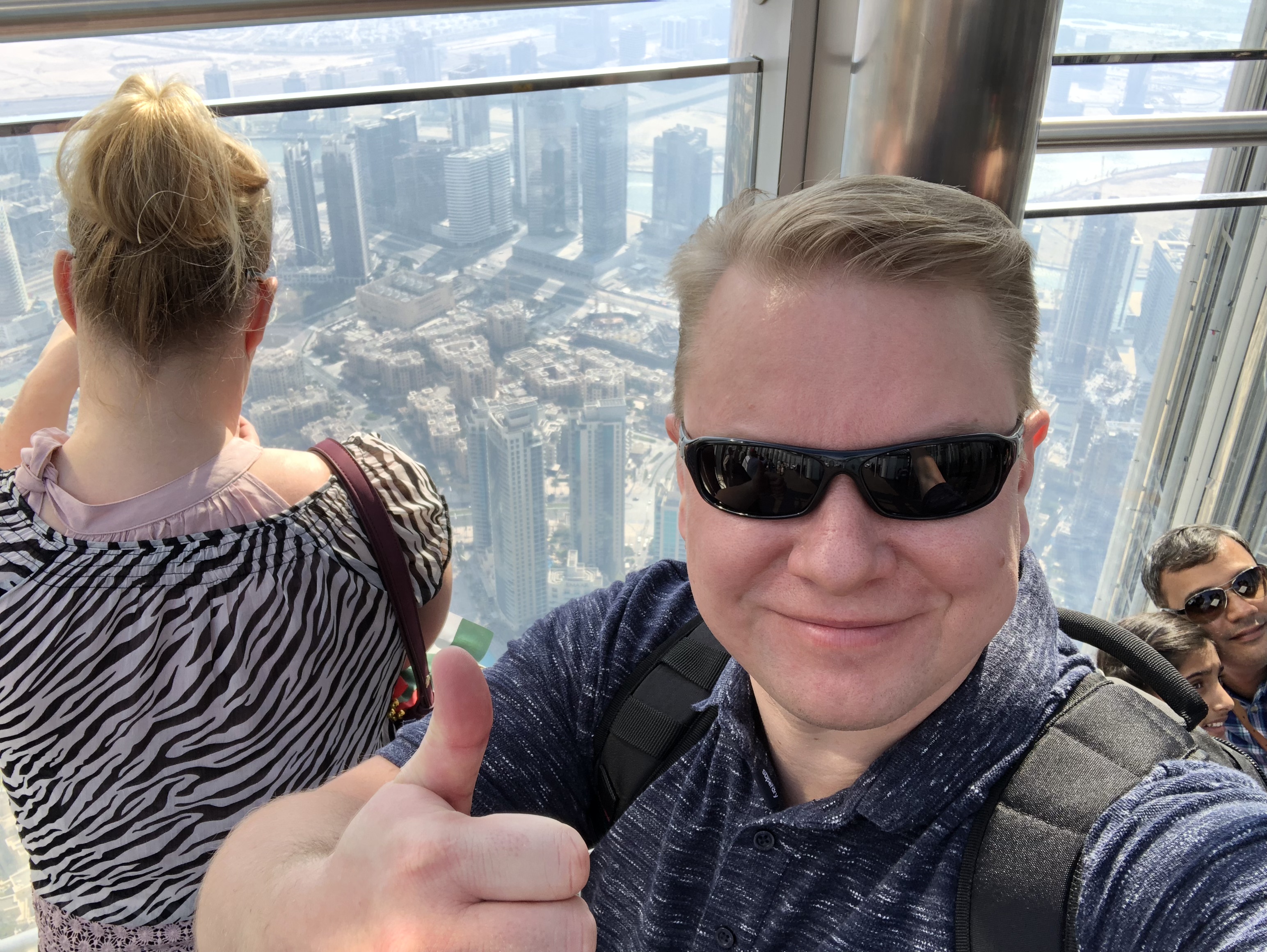 Dubai on tunnettu siitä, että kaiken pitää olla maailman suurinta. Edellisellä reissulla ei jäänyt aikaa käydä maailman korkeimmassa rakennuksessa, joten tällä kertaa otettiin vahinko takaisin ja varattiin käynti. Ei lähdetty hulluttelemaan At The Top Sky -lipuilla (148. kerros) vaan tyydyttiin normaalilippuihin, joilla pääsi 125. kerrokseen.