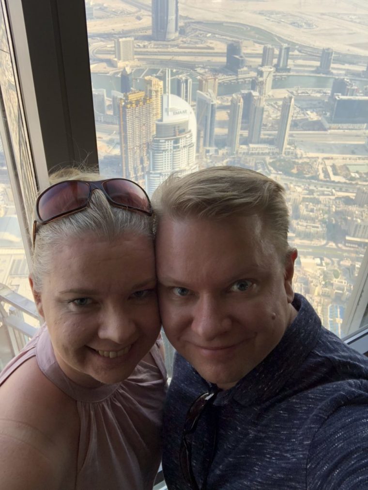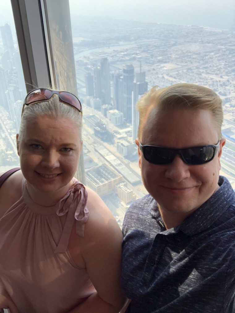 Kierreltiin ulkoterassi ihan kaikessa rauhassa ja tehtiin samaa kuin kaikki muutkin – kauhisteltiin miten korkealla ollaan ja heti perään käännyttiin selin kaiteeseen/lasiseinään ja otettiin selfieitä. 😀 Koska eihän sitä muuten tapahtunut, jos ei asiasta ole kuvaa. Ylhäällä toimi wifikin mainiosti, ehkäpä juurikin tästä syystä..