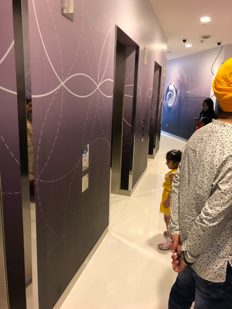 Kun tuli aika lähteä alaspäin, niin huomattiin että myös alaspäin menevään hissiin täytyy jonottaa, luonnollisesti. Siinä hetken aikaa jonossa seisottuamme tuli joku henkilökuntaan kuuluva viittilöimään, että seuratkaapas häntä. Kävi ilmi että supernopeakaksikerroshissi ei ole ainoa hissi joilla turisteja kuljetellaan ylös-alas. Pienempiä porukoita viedään myös talon asukkien ja yritysten käyttämillä hisseillä, näissä joutuu vain pariin kertaan vaihtamaan hissiä. Omaan makuun tämä sopi oikeinkin hyvin, sillä nyt pääsi näkemään noita välikerrosten tilojakin hieman tarkemmin.