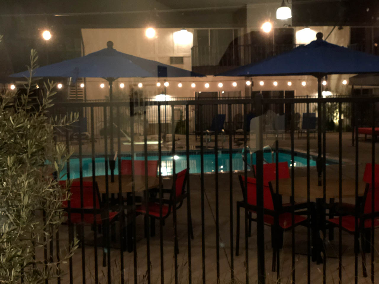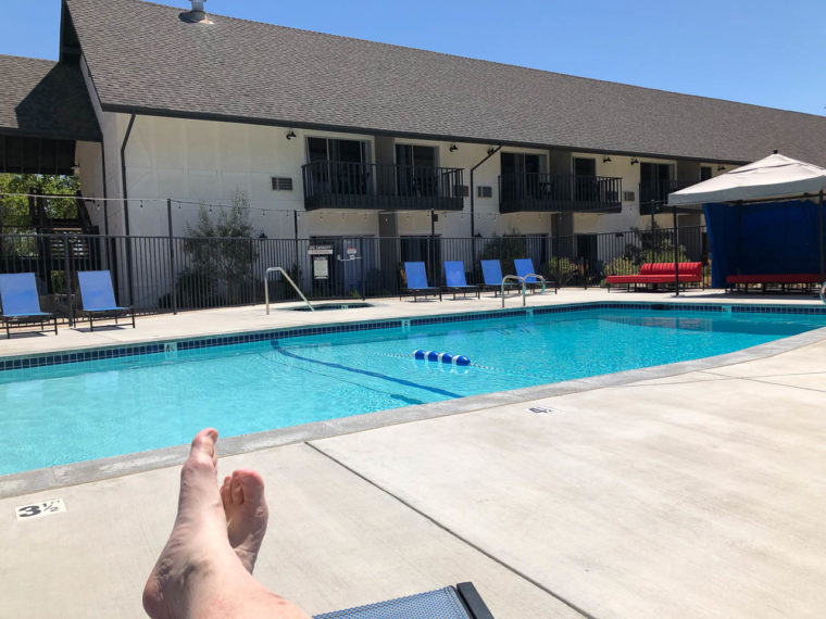 Hotellin uima-altaalla rentouduttiin auringonpaisteessa niinkin hyvin että reidet ja korvalehdet ottivat vähän turhan paljon punaa. Tästä säikähtyneenä siirryttiin huoneen puolelle odottelemaan illallisaikaa. Koska Ossi ei ollut nähnyt Sideways-leffaa koskaan, tässä kohti oli hyvä hetki vilkaista se läpi. Naureskeltiin elokuvan aikana kun pojathan kiersivät siinä juurikin samat paikat, joita oltiin juuri koluttu. Semminkin Hitching Postissa kävivät syömässä ja juomassa.