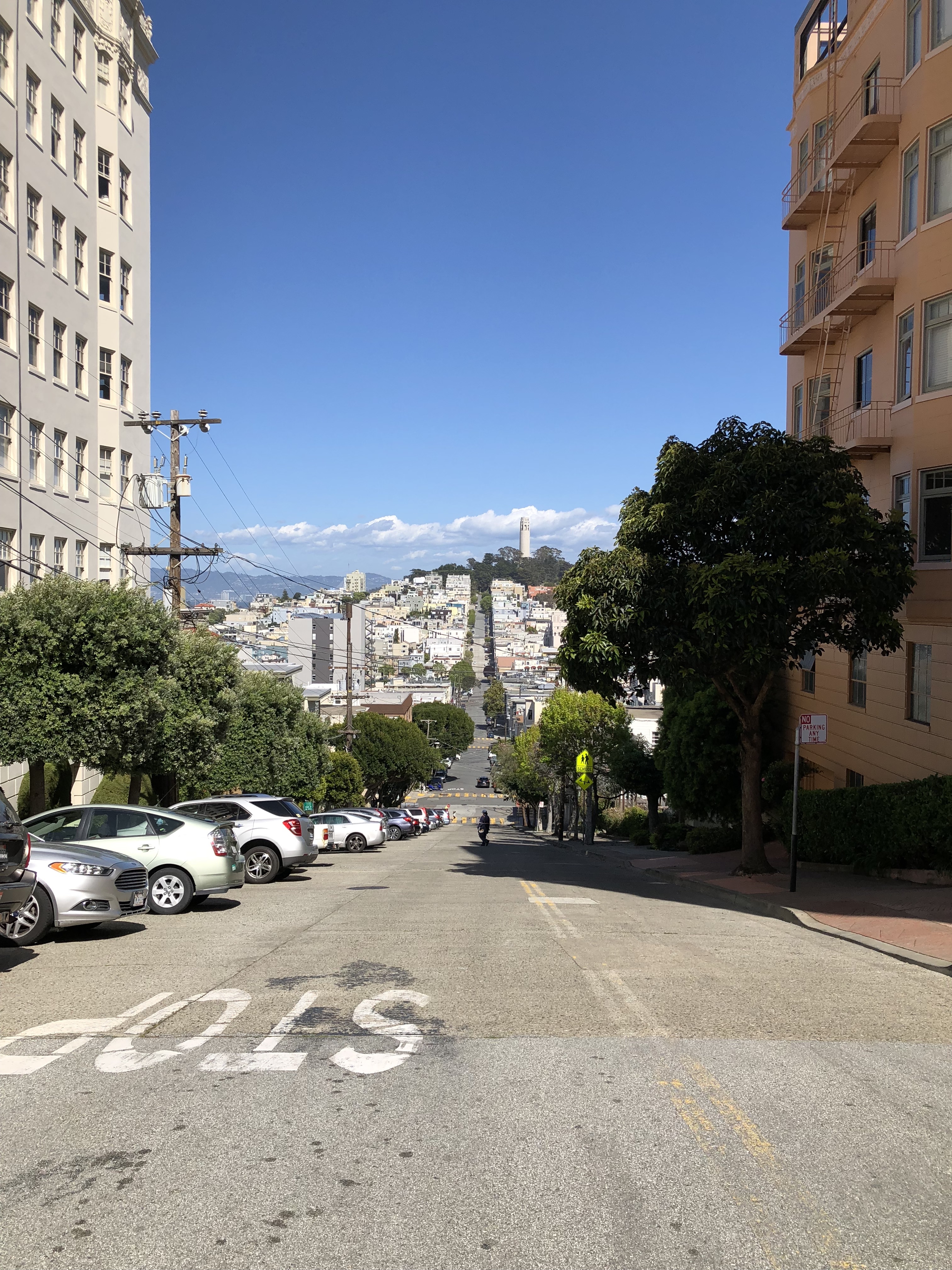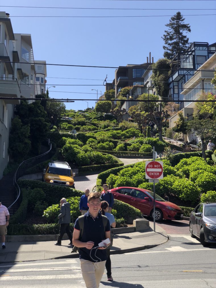 Ruoan jälkeen suunnattiin pitkin Lombard streettia kuuluisalle siksakki-pätkälle. Ajettiin autolla reitti läpi, mutta enemmän minusta oli menovaihe jännempi – sen verran jyrkkä nousu Lombardin huipulle oli. Hauskana yksityiskohtana tielle pystyi parkkeeraamaan auton. Ei taitaisi kotimaan talvessa onnistua.